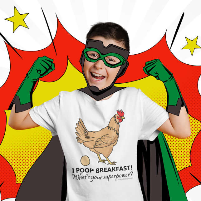 Chicken Poops Breakfast Funny Design featuring a brown chicken / hen that laid a brown egg. "I Poop Breakfast! What's your superpower?" Chickens, like all birds, have a single opening called the cloaca through which they excrete, mate and lay eggs. So you could say eggs come out of a chicken's bum AND it's fanny, since the same hole serves both purposes. BUT, when an egg comes out, the chicken’s Cloaca is turned inside out so that the egg cannot come in contact with the intestines (fecal matter nastiness). So now you can tell your kids or friends where chicken eggs come from!